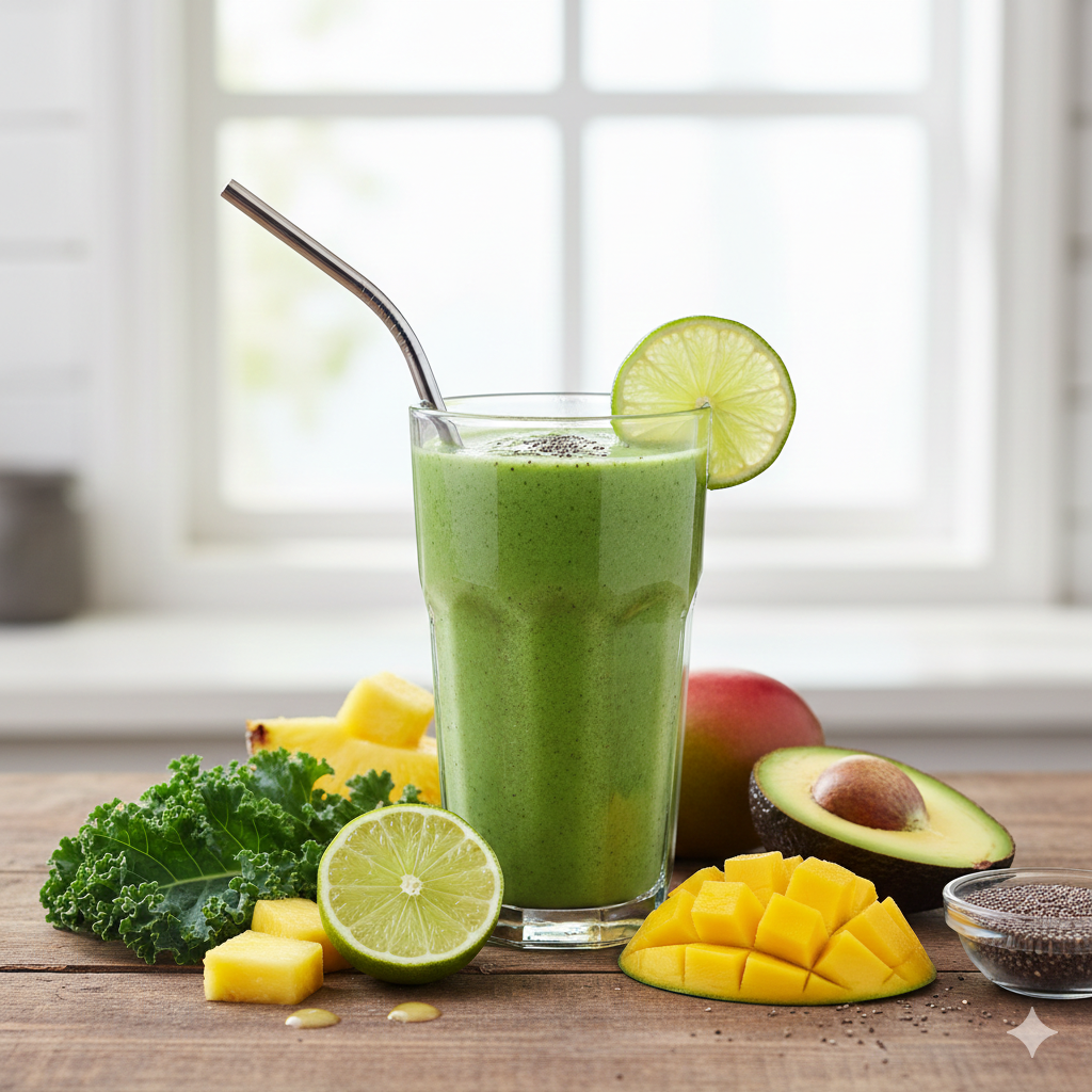 เมนูนี้เหมาะสำหรับผู้ที่ต้องการวิตามินซีและโฟเลตแบบเต็มร้อย โดยใช้ผลไม้ที่มีกรดมาช่วยลดข้อเสียของสารบางชนิด สิ่งที่ต้องเตรียมมีเพียงใบเคลสด, สับปะรดหรือมะม่วงน้ำดอกไม้ น้ำมะนาว และเมล็ดเจีย วิธีปรุงคือใส่เมล็ดเจียหรืออะโวคาโดลงไปเล็กน้อย เพื่อให้มีไขมันช่วยดูดซึมวิตามิน K จากใบเคลสด จากนั้นปั่นค่ะ ซึ่งการปั่นช่วยย่อยใยอาหารที่แข็งของเคลดิบ ทำให้ร่างกายนำไปใช้งานได้ง่ายขึ้น และวิตามินซีจากสับปะรดและมะนาวจะช่วยเพิ่มการดูดซึมธาตุเหล็ก ที่มีอยู่ในเคลได้ดียิ่งขึ้น