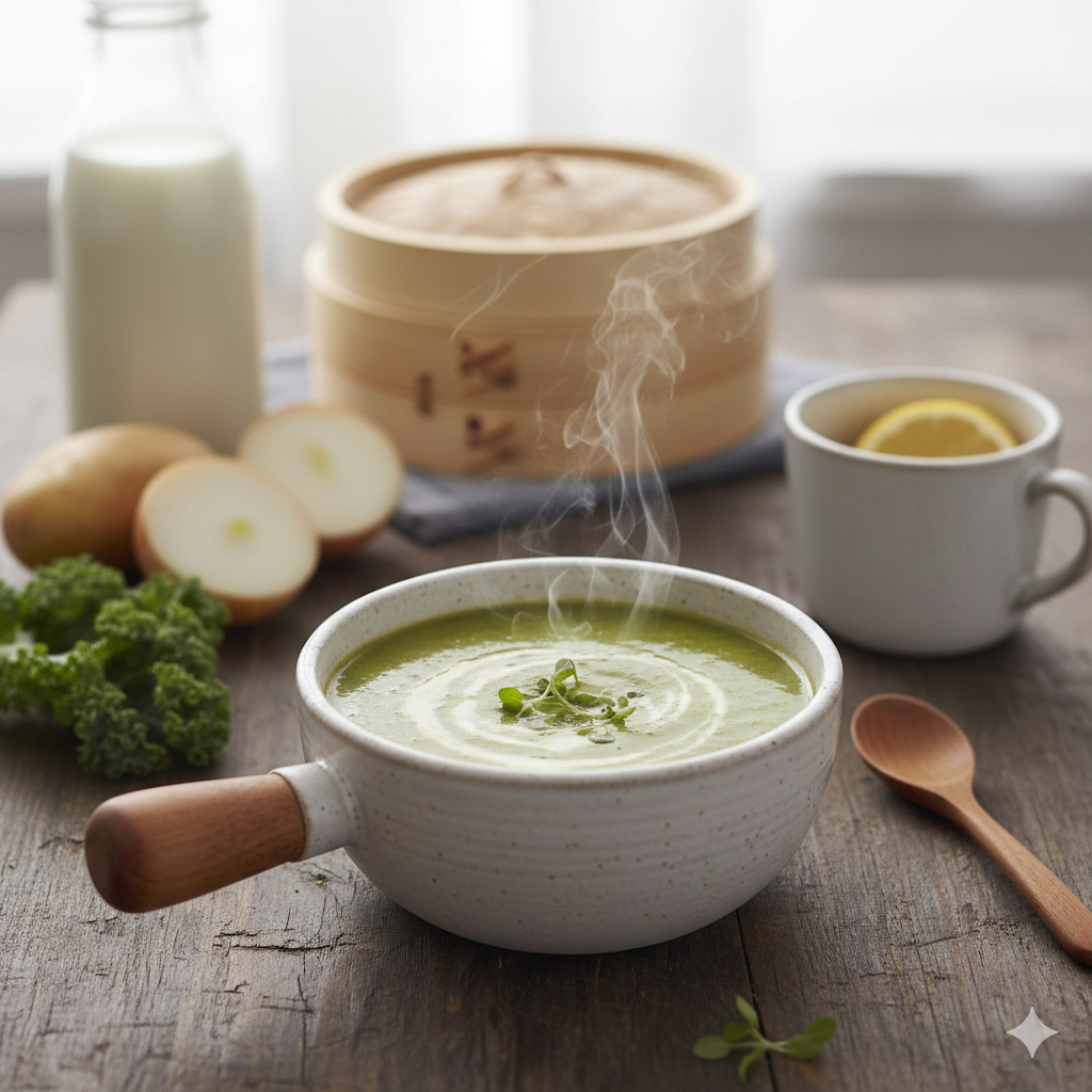 เมนูนี้เน้นการทำให้สุกทั่วถึง เพื่อลดสาร Goitrogens และออกซาเลต เหมาะกับผู้ที่กังวลเรื่องนิ่วหรือระบบไทรอยด์ เพียงนำเคลไปนึ่งจนนิ่ม ผักกับหอมหัวใหญ่ มันฝรั่งและนมอัลมอนด์ โดยการนึ่งเป็นวิธีที่ดีที่สุดในการลดสารขัดขวางการดูดซึมแร่ธาตุ โดยที่ยังรักษาแร่ธาตุอย่างโพแทสเซียมไม่ให้ละลายหายไปกับน้ำเหมือนการต้ม และการนึ่งจนสุกยังช่วยลดสาร Goitrogens ที่อาจไปยับยั้งการผลิตฮอร์โมนไทรอยด์