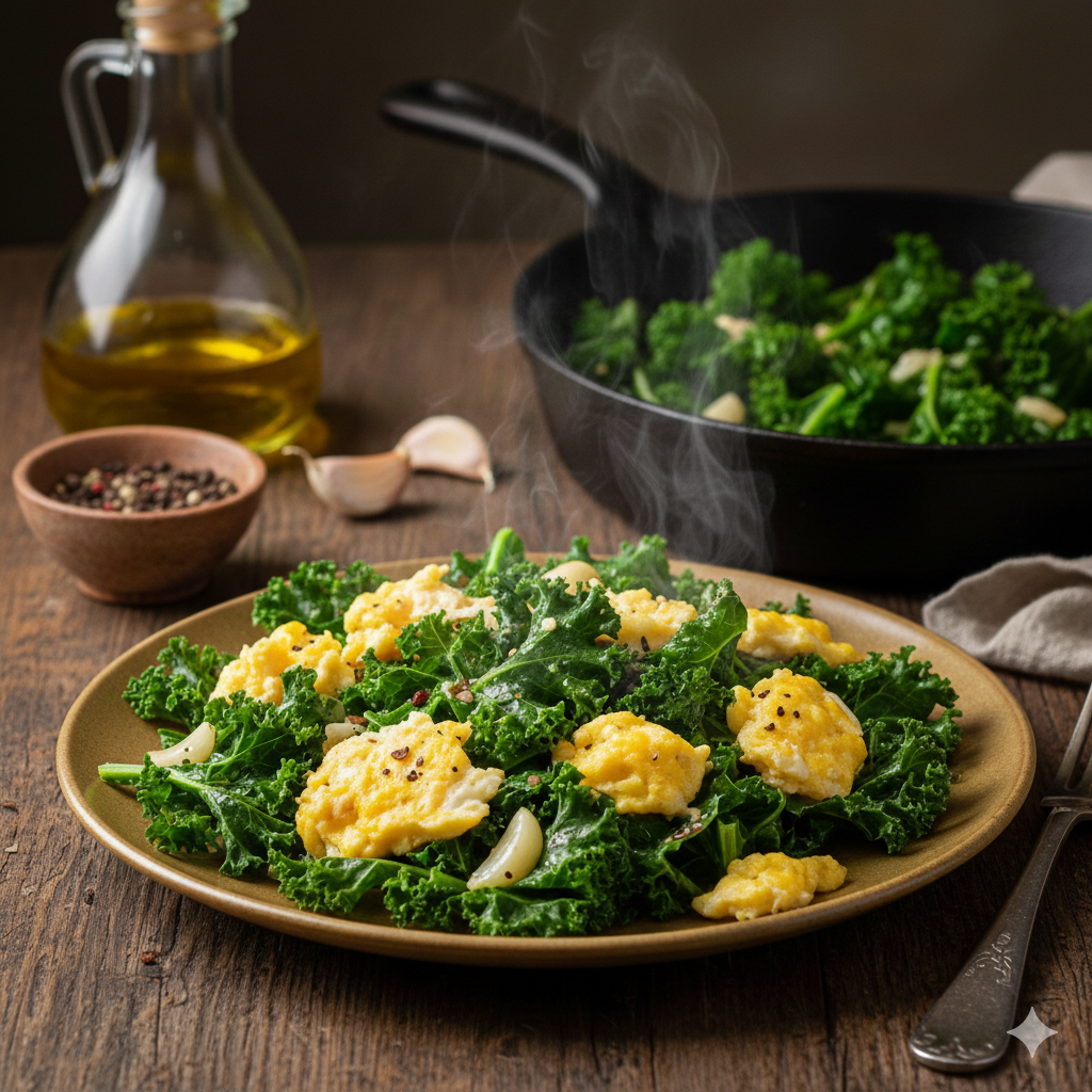 เมนูนี้เน้นการใช้ความร้อนและไขมันดี เพื่อให้ร่างกายดูดซึมเบต้าแคโรทีน ลูทีน และซีแซนทีน (สารบำรุงสายตา) ได้ดีที่สุด โดยส่วนประกอบมีเพียงใบเคลหยักฉีก ไข่ไก่ น้ำมันมะกอกและกระเทียมสับ นำมาผัดด้วยไฟแรงที่ใช้เวลาสั้นๆ เพื่อให้ผักยังกรอบและไม่สูญเสียวิตามินซีมากเกินไป